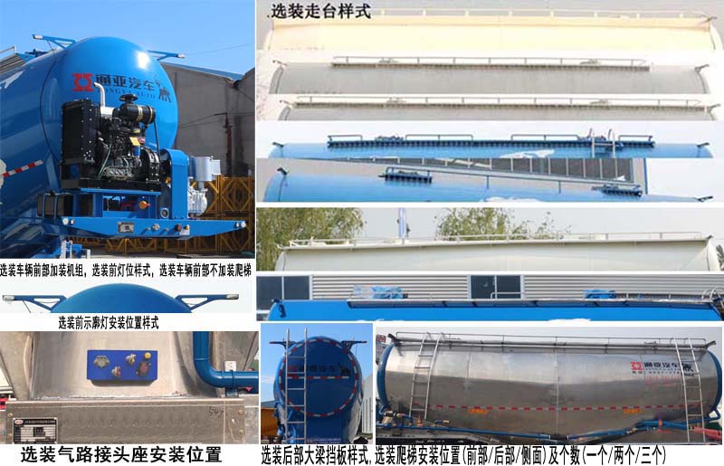 | 備注 | 頂部封閉不可開槽,后部不可開啟;罐體材質(zhì):鋁合金,罐體有效容積:30立方米,運輸介質(zhì):固井專用水泥,介質(zhì)密度:1200千克/立方米;罐體外形尺寸罐體長(含封頭)8540mm,最大截面處寬2550mm,最大截面處高3040mm,前后封頭直徑為2000mm(選裝前后封頭直徑為1900mm),選裝罐體長(含封頭)為8050mm,最大截面處寬2550mm,最大截面處高3040mm,前后封頭直徑為2000mm(選裝前后封頭直徑為1900mm);選裝前部加裝機組時整車長度(mm)為:9500,選裝走臺樣式,選裝前位燈樣式,選裝爬梯安裝位置(前部/后部/側(cè)面)及個數(shù)(一個/兩個/三個),選裝前示廓燈安裝部件樣式,選裝氣路接頭座安裝位置,選裝后部大梁擋板樣式;ABS系統(tǒng)生產(chǎn)廠家:廣州瑞立科密汽車電子股份有限公司,梁山順安達汽車科技有限公司,廣州市西合汽車電子裝備有限公司,型號:CM2XL-4S/2M,SAD-ABS4S/2M,XH-GQ4S2M-E01;側(cè)面及后下部防護裝置所用材料材質(zhì)為:鋁合金,側(cè)面及后下部防護裝置與車輛連接方式均為:螺栓連接,后部防護裝置的主要尺寸參數(shù):斷面尺寸(mm)為120×68,離地高度為:500mm; 車長/牽引銷到車輛最前端距離/軸距/后懸對應關(guān)系為:9500/1230/4800+1310+1310/850,9500/1470/4560+1310+1310/850,8720/530/4800+1310+1310/770,8720/450/4800+1310+1310/850,8720/960/4370+1310+1310/770,8720/690/4560+1310+1310/850,8300/540/4370+1310+1310/770. | ||