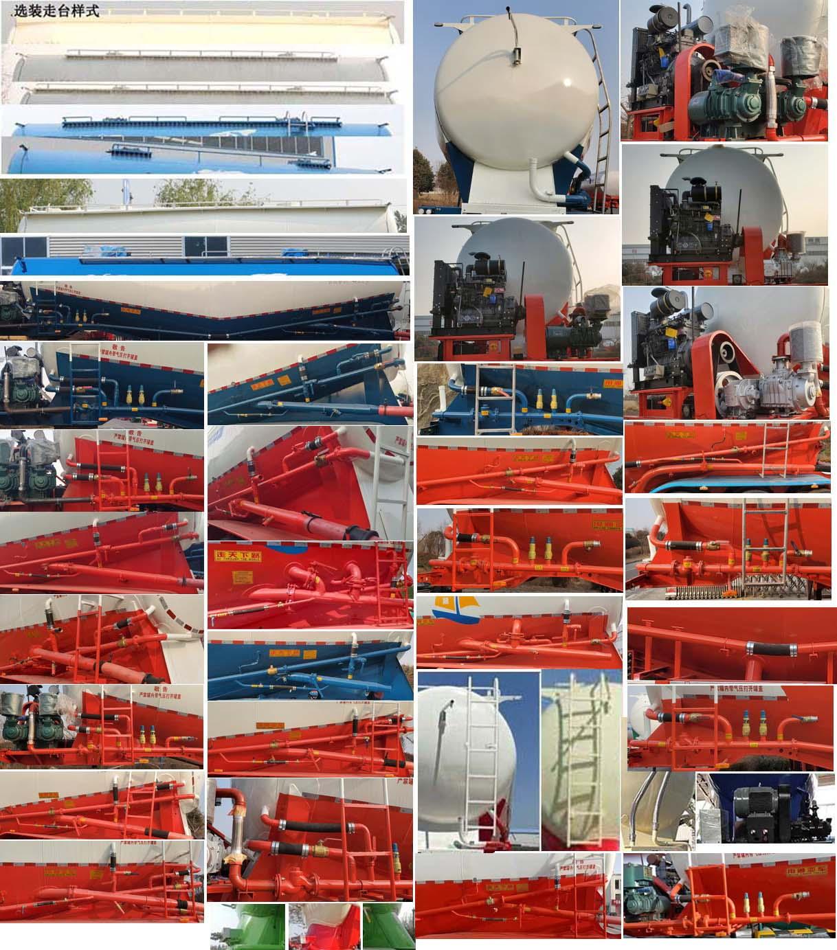 頂部封閉不可開槽,后部不可開啟;罐體有效容積:29.3立方米,運輸介質:干拌砂漿配料,密度:1170千克/立方米;當罐體外形尺寸罐體長(含封頭)8540mm,最大截面處寬2550mm,最大截面處高3100mm,前后封頭直徑為1810mm(選裝前后封頭直徑為1710mm),選裝罐體外形尺寸罐體長(含封頭)8050mm,最大截面處寬2550mm,最大截面處高3100mm,前后封頭直徑為1810mm(選裝前后封頭直徑為1710mm);當輪胎型號為11R22.5 14PR時,輪胎中間加裝雨簾;選裝走臺樣式,選裝后組合燈樣式,選裝車輛前部加裝機組,選裝爬梯安裝位置及個數(一個/兩個/三個),選裝前后封頭處進氣管位置和個數,選裝后部大梁圓孔樣式和非圓孔樣式,選裝大梁后部圓弧樣式,選裝牽引銷后大梁樣式;ABS系統生產廠家:廣州瑞立科密汽車電子股份有限公司,梁山順安達汽車科技有限公司,廣州市西合汽車電子裝備有限公司,型號:CM2XL-4S/2M,SAD-ABS4S/2M,XH-GQ4S2M-E01;側面及后下部防護裝置所用材料材質為:Q235,側面及后下部防護裝置與車輛連接方式均為:螺栓連接或焊接,后部防護裝置的主要尺寸參數:斷面尺寸(mm)為120×68,離地高度為:500mm;車長/牽引銷到車輛最前端距離/軸距/后懸對應關系為:9500/1470/4560+1310+1310/850,8720/690/4560+1310+1310/850,9500/1310/4800+1310+1310/770,8720/530/4800+1310+1310/770,9050/1210/4370+1310+1310/850,8300/460/4370+1310+1310/850,9050/1290/4370+1310+1310/770,8300/540/4370+1310+1310/770.