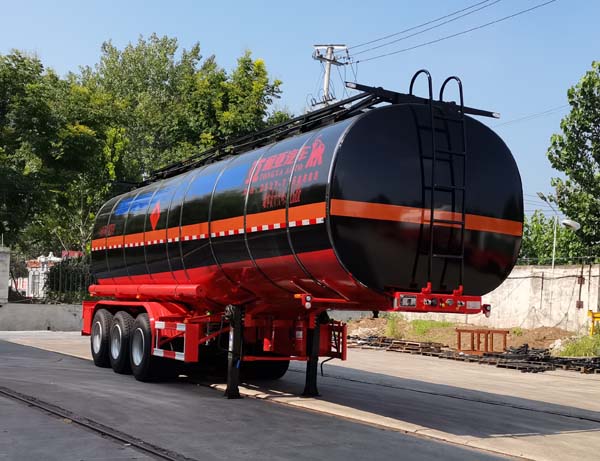 | 采用適用于牽引危險品運輸半掛車的牽引車,危險貨物運輸車輛類型:FL型,準運介質的最大密度:900千克/立方米;罐體總容量35.7立方米,罐體有效容積:33.8立方米,保溫層內部罐體外形尺寸為:長9700mm,寬2350mm,罐體為鵝頸式,前端高度:1950mm,后端高度:2150mm,當保溫層厚度為50mm時,罐體(含保溫層)外形尺寸為:長9800mm,寬2450mm,罐體為鵝頸式,前端高度:2050mm,后端高度:2250mm;當保溫層厚度為80mm時,罐體(含保溫層)外形尺寸為:長9860mm,寬2510mm,罐體為鵝頸式,前端高度:2110mm,后端高度:2310mm,當保溫層厚度為100mm時,罐體(含保溫層)外形尺寸為:長9900mm,寬2550mm,罐體為鵝頸式,前端高度:2150mm,后端高度:2350mm;該車采用空氣懸架,安裝盤式制動器;EBS系統生產廠家:廣州瑞立科密汽車電子股份有限公司;EBS型號:CM-TEBS;側面及后下部防護裝置所用材料材質均為:Q235,側面及后下部防護裝置與車輛連接方式均為:螺栓連接,后部防護裝置的主要尺寸參數:斷面尺寸(mm)為120×68,離地高度為:500mm. | |||