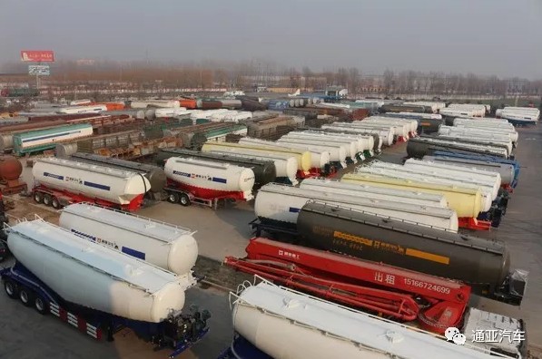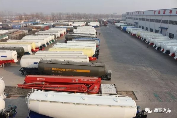 成品庫一排排的粉罐車等待客戶前來提車。